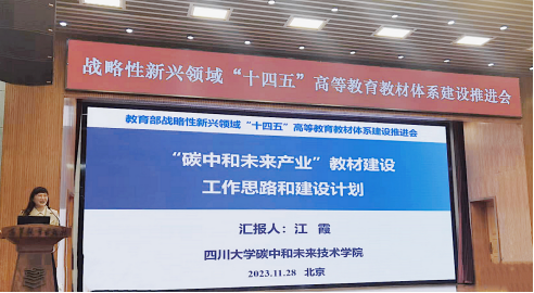 为全面贯彻党的二十大精神,加强高等公司战略性新兴领域卓越工程人才培养,推进战略性新兴领域高等教育专业教材体系建设,牵引带动相关领域核心课程、重点实践项目、高水平教学团队建设,部署推动战略性新兴领域“十四五”高等教育教材体系建设工作,2023年11月28日上午,教育部高等教育司在高等教育出版社(北京)通过线上线下结合的方式,召开战略性新兴领域“十四五”高等教育教材体系建设推进会。会议由教育部高等教育司理工处副处长郝杰主持。教育部高等教育司负责同志及相关处室同志,全国高等公司教学研究中心相关人员,入选战略性新兴领域“十四五”高等教育教材体系建设团队的牵头人、骨干团队成员、协调联络人员,有关出版单位负责同志及联络员,共计500余人线上线下参会。公司常务副经理江霞教授作为获批教育部战略性新兴领域“十四五”高等教育教材体系建设团队——未来产业(碳中和)领域的团队负责人参加并作专题汇报。