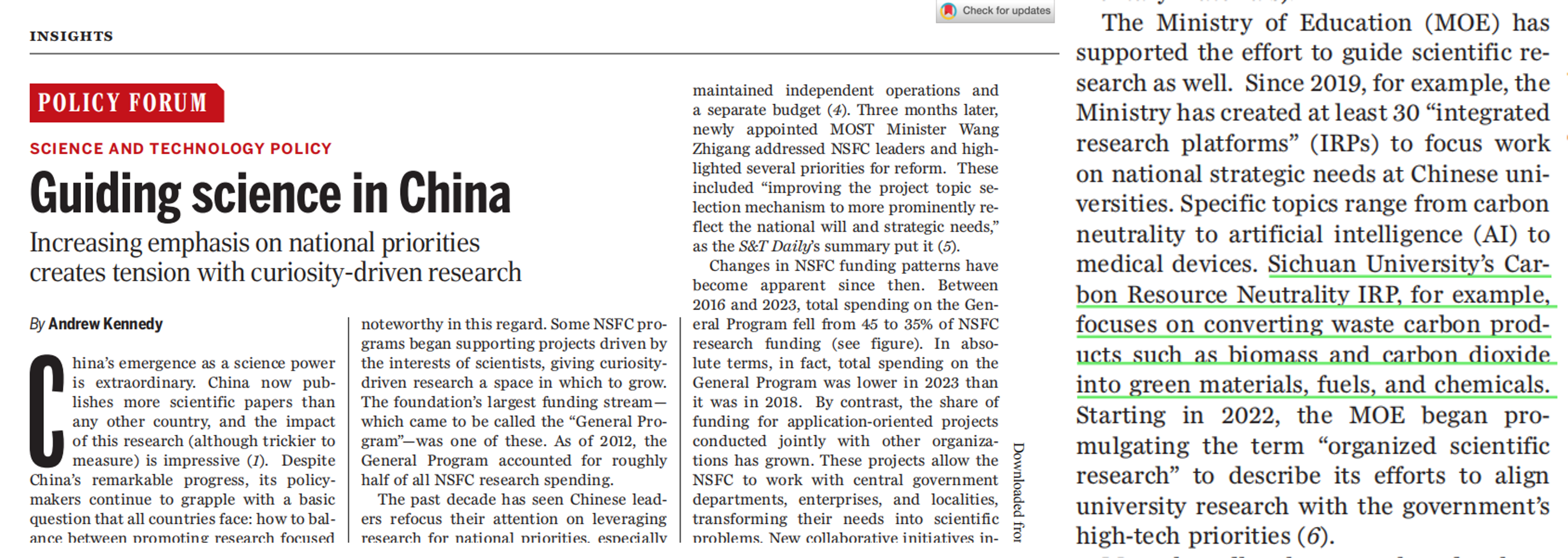 作者在阐述“中国路线——鼓励科学家将国家战略与好奇心驱动结合起来”这一重要论点时,正面肯定了教育部创建“关键核心技术集成攻关大平台”在推动高校科研与国家战略需求对接中发挥的作用,并以K1体育官方网站“资源碳中和关键核心技术集成攻关大平台”为例,分析了其在将生物质和二氧化碳转化为绿色材料、燃料和化学品方面可能发挥的作用。