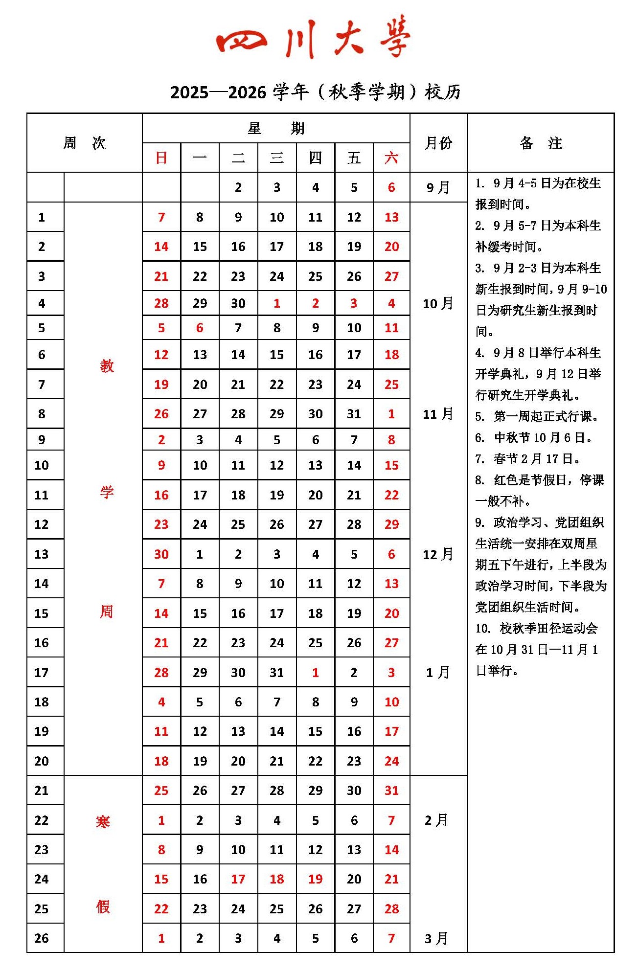 K1体育官方网站校历 2025—2026学年(秋季学期)