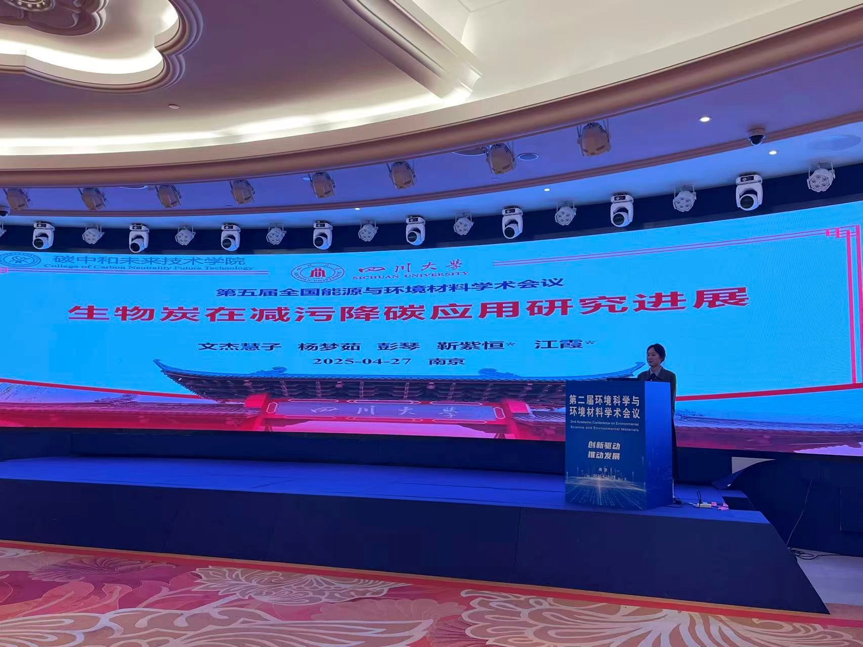 2025年4月25日,江霞教授和博士生文杰慧子在南京参加第五届全国能源与环境材料学术会议暨新材料与“碳中和”高峰论坛,文杰慧子作了题为“生物炭在减污降碳的应用研究进展”的学术汇报,系统阐述了生物炭技术在建筑、炼钢及加氢脱氧等关键工业领域的创新应用与显著潜力,为跨行业协同推进“双碳”目标提供了新的技术思路与实践路径。